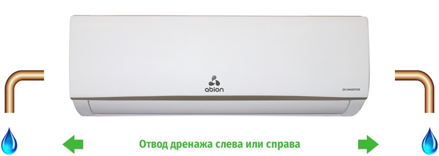 | Кондиционеры Abion 2018 года позволяют подключать отвод дренажа с любой стороны внутреннего блока. Теперь, при выборе места для установки кондиционера, вы руководствуетесь только личными предпочтениями. |