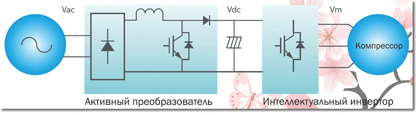 3-DС инверторная технология В инверторных кондиционерах полного цикла цифровой сигнал с платы управления поступает на импульсный блок питания для плавной регулировки интенсивности работы компрессора и двигателей